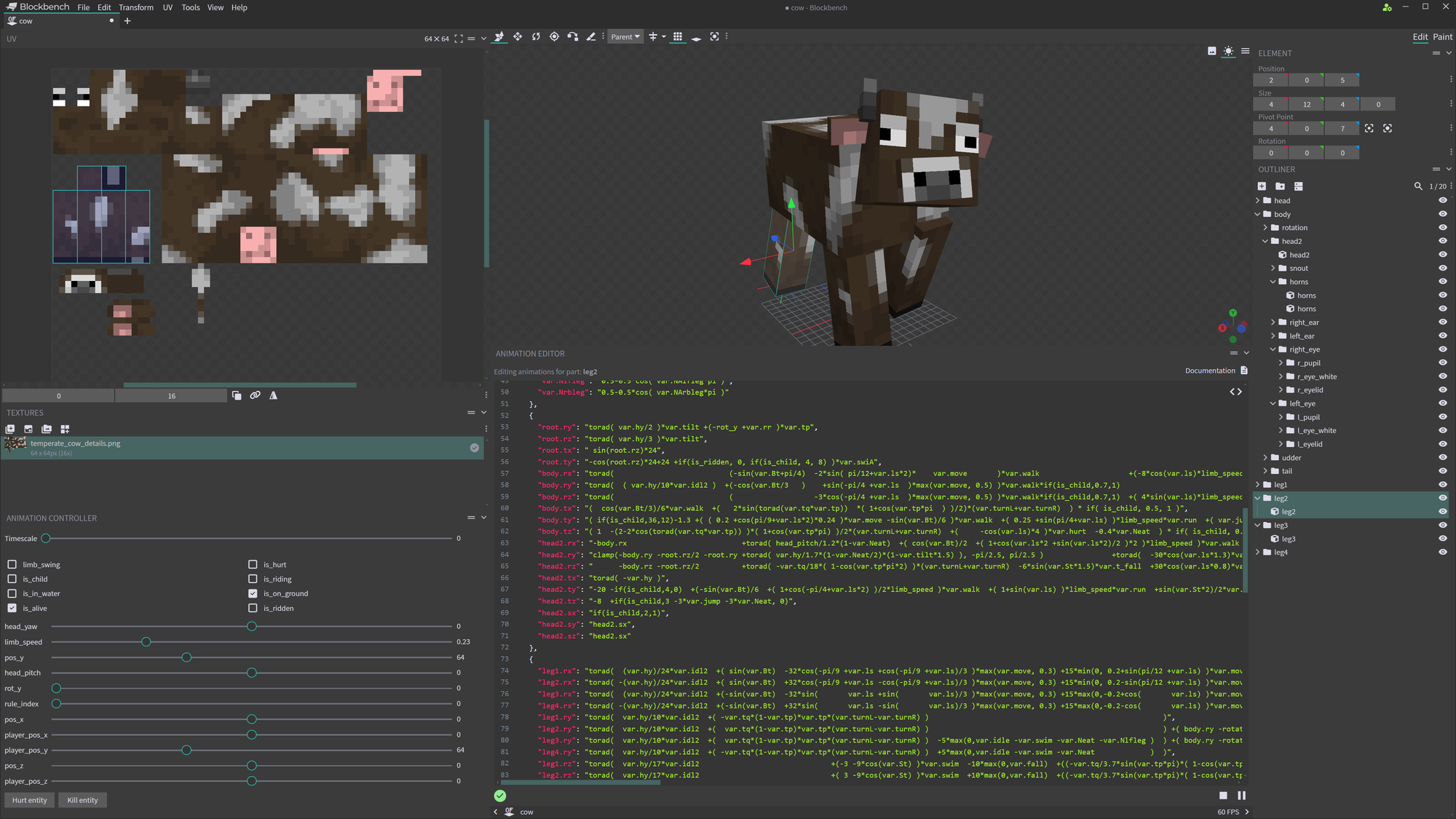 To start animating, I open the model file in a code editor called Notepad++ and add an "animations" section to the file. If a mob is similar enough in behaviour and/or appearance of a previous addition, like sheep, cows and pigs, I copy-paste this section as a template because it's helpful to keep the same format across all mobs relatively similar, and when you want to use the same variables there's not much point in starting from scratch. Most mobs will have idle/bobbing, head directions, walking, running and swimming, so I'll at least copy the variables for those. Hostile mobs also get attack and aggressive animations for when they chase the player. From there, I either tweak the animations accordingly or start fresh.