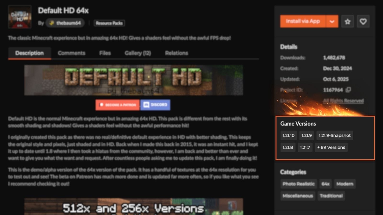 Let’s say you want to install the Default HD 64x texture pack. The supported versions can be found in the Game Versions section, and the resolution is in the Categories section.
