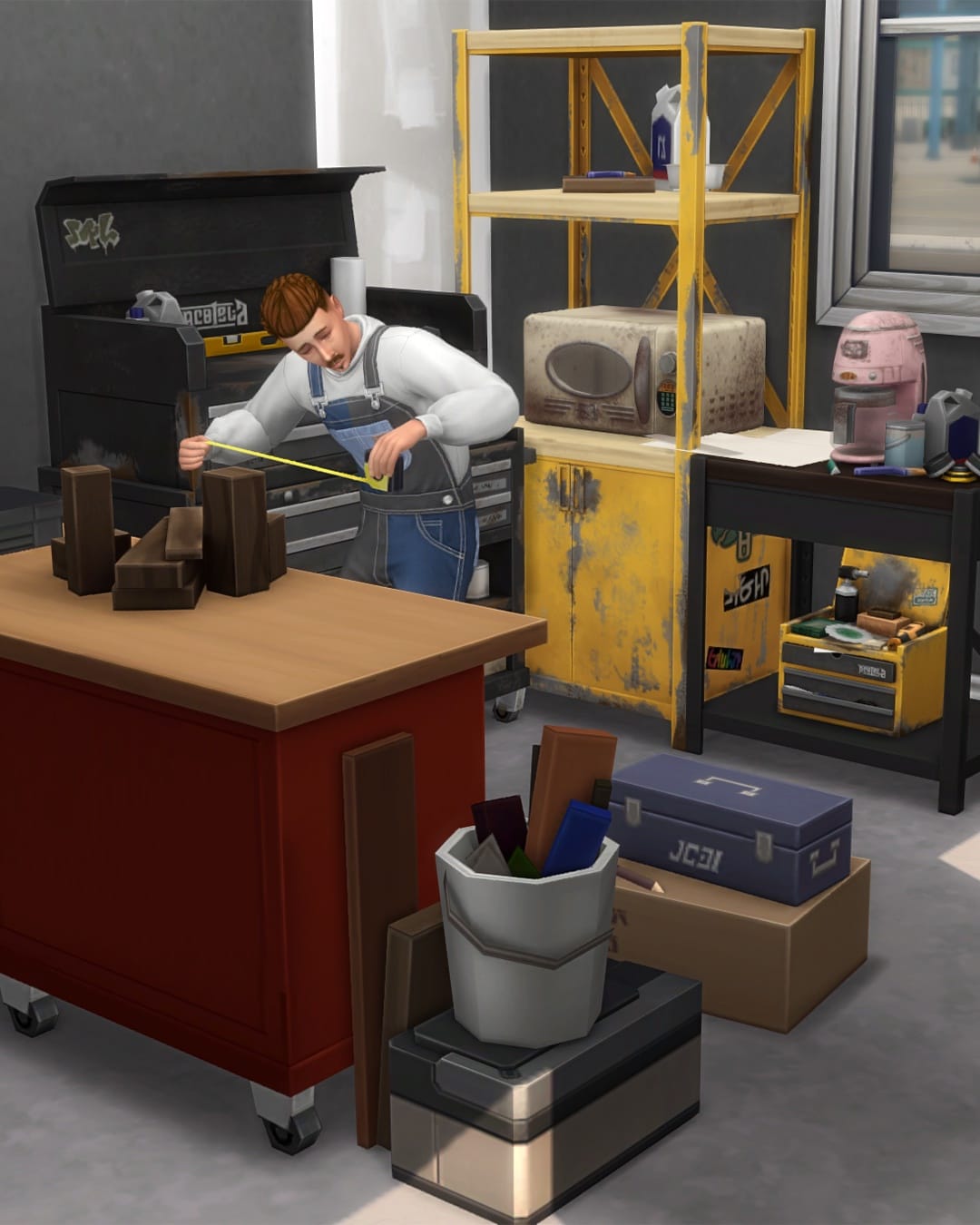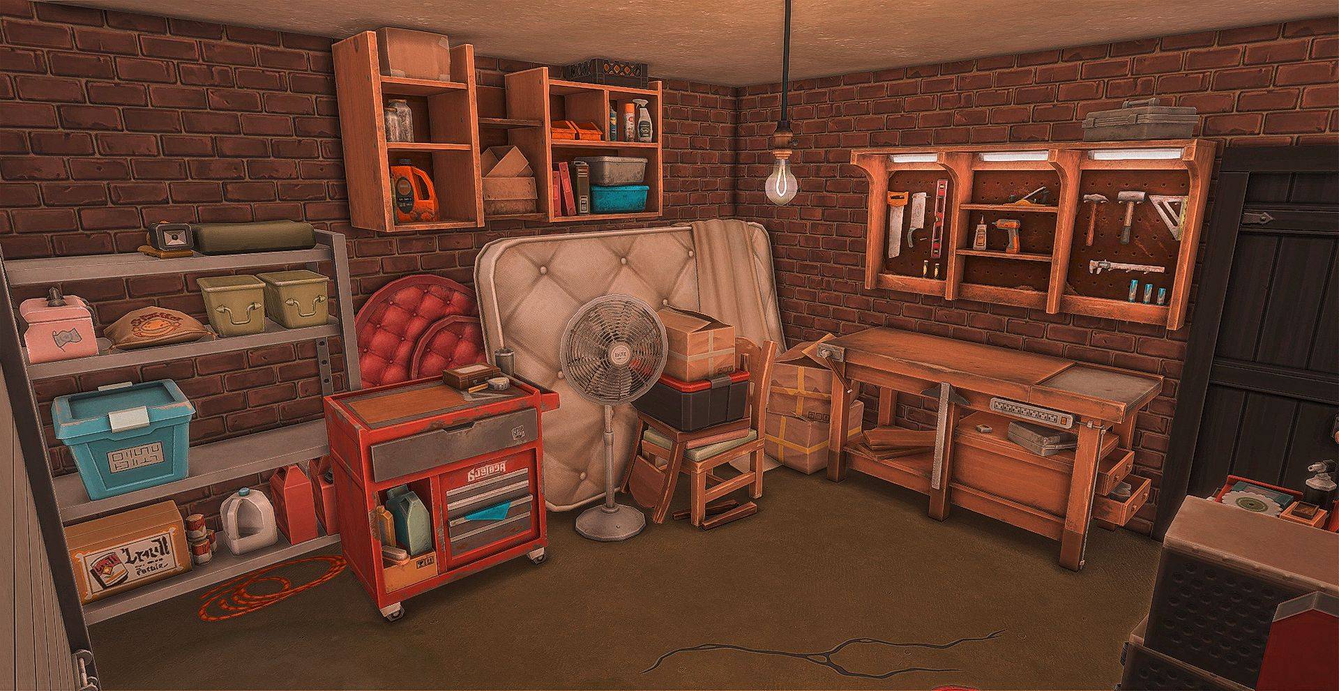 Need a garage with both chaos & charm? This no-CC garage has everything your sims need, from tools to stored goods. The Basement Treasures & Restoration Workshop kits have been used in this downloadable room.